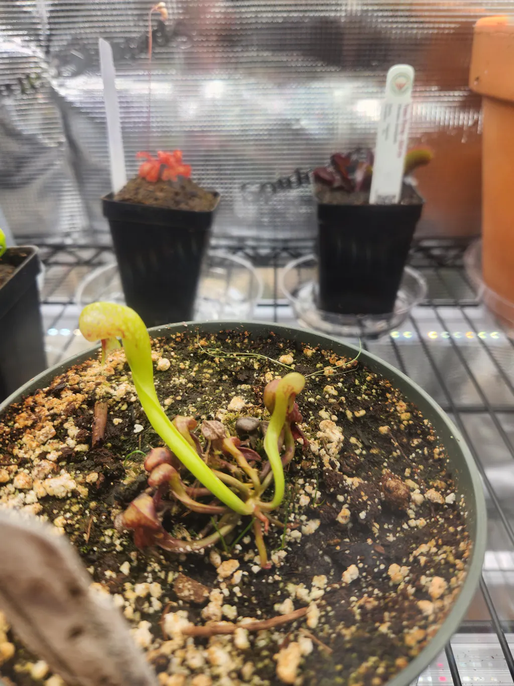 Growth Habit: Darlingtonia grow tall pitchers from rhizomes in the soil. They produce stolons that wrap around their pots, and new plants will grow from them. Darlingtonia die back to their rhizomes in winter, when they are dormant. They begin to develop their new pitchers for the year in May or June and produce many pitchers until winter when they die back. These pitchers can be cut back to the base of the plant when they turn brown fully.