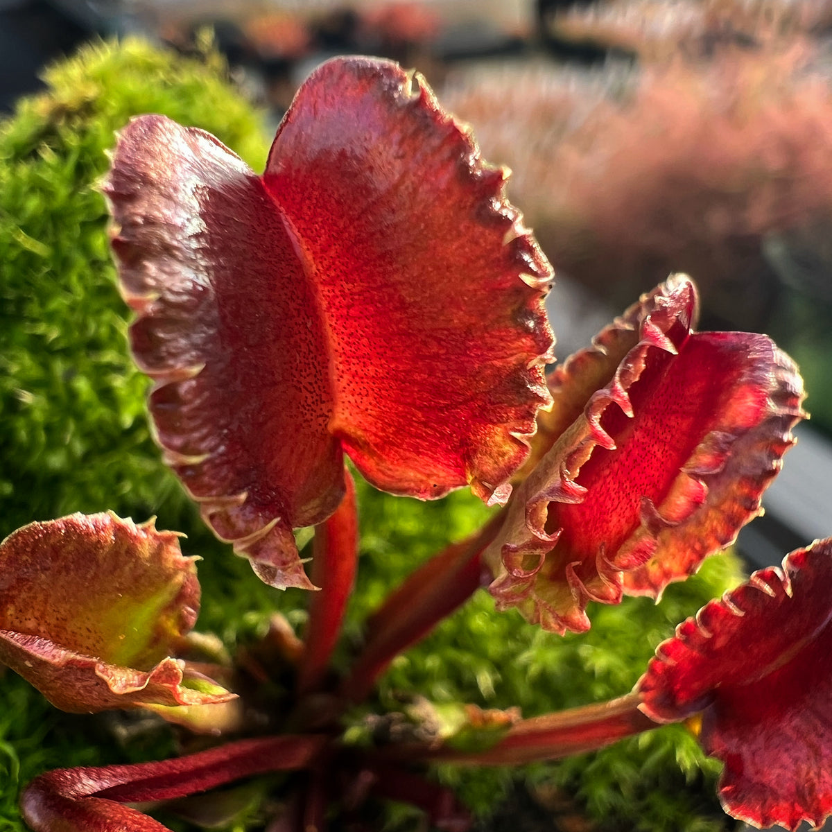 Dionaea m. "AR Werewolf” is a rare and highly sought after, all red, flytrap with wicked claws lining each trap! Similar to ‘Werewolf’ in its form and shape, each trap looks like a wolf paw, claws out ready to slash! These plants all blush a deep red making them exceptionally striking.