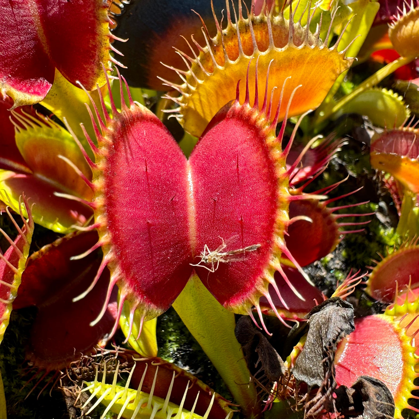 Dionaea muscipula 'Ginormous' is a renowned giant cultivar boasting enormous, bright candy-apple-red traps with thick petioles and incredibly robust outdoor growth. It's a voracious predator, capturing a multitude of bugs with its large, powerful traps!