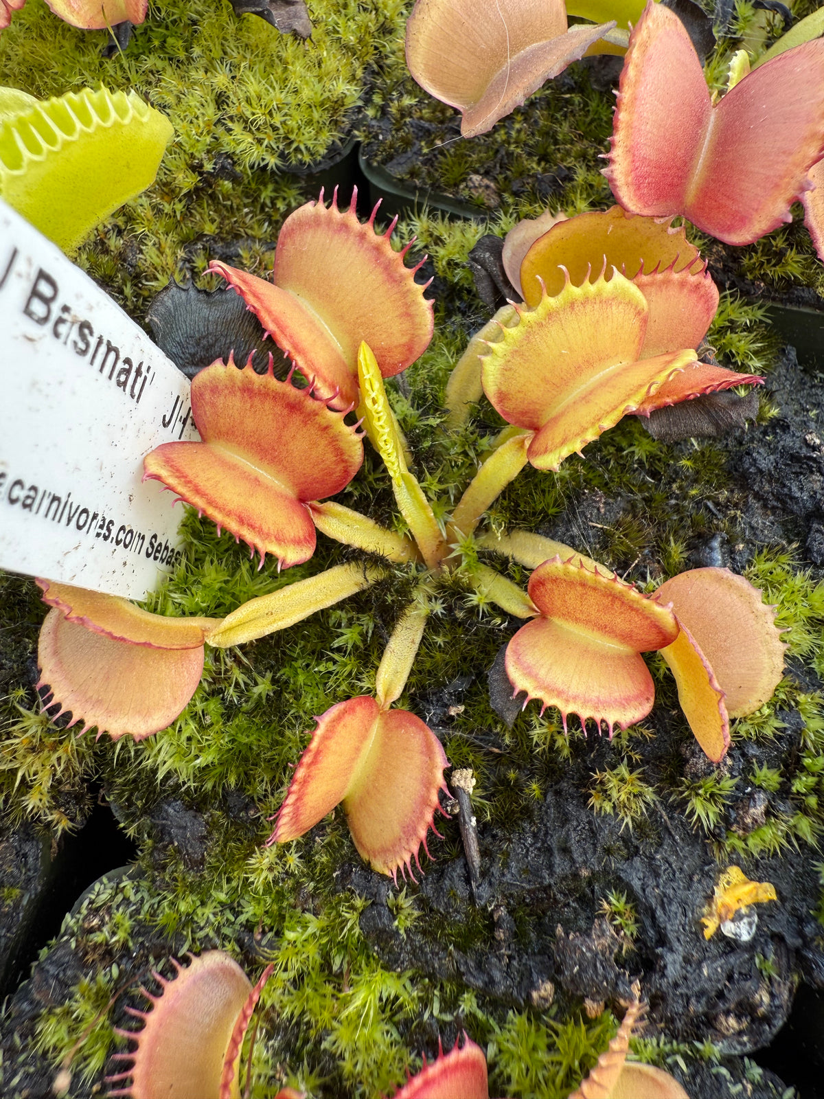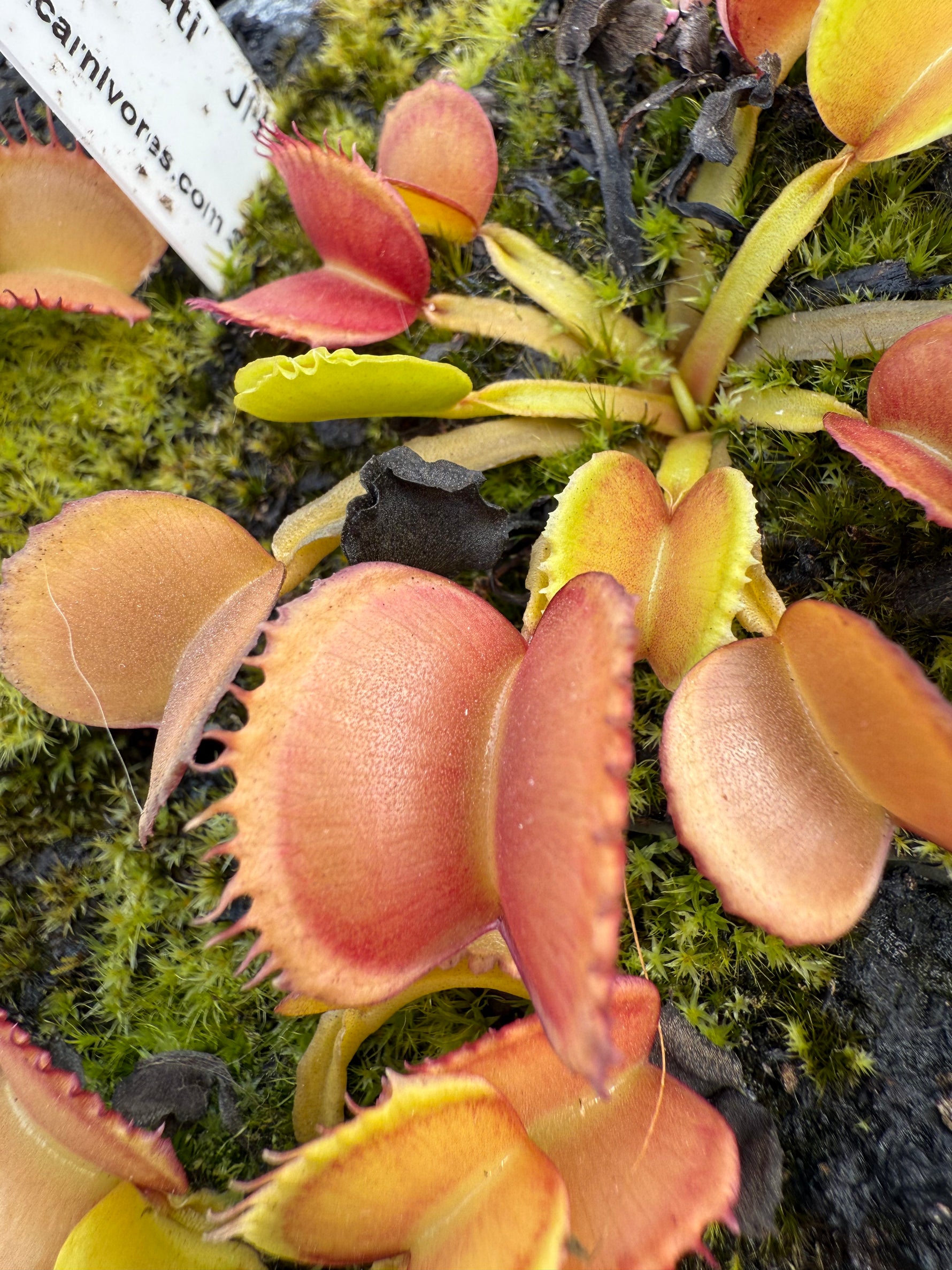 Dionaea m. “GJ Basmati” is a showstopper of a cultivar from the famous GreenJaws nursery. The large, chartreuse green traps are gently rippled along the edges, the teeth barely formed, and each trap delicate and elegant. Over the summer they deepen to a pinky-red.