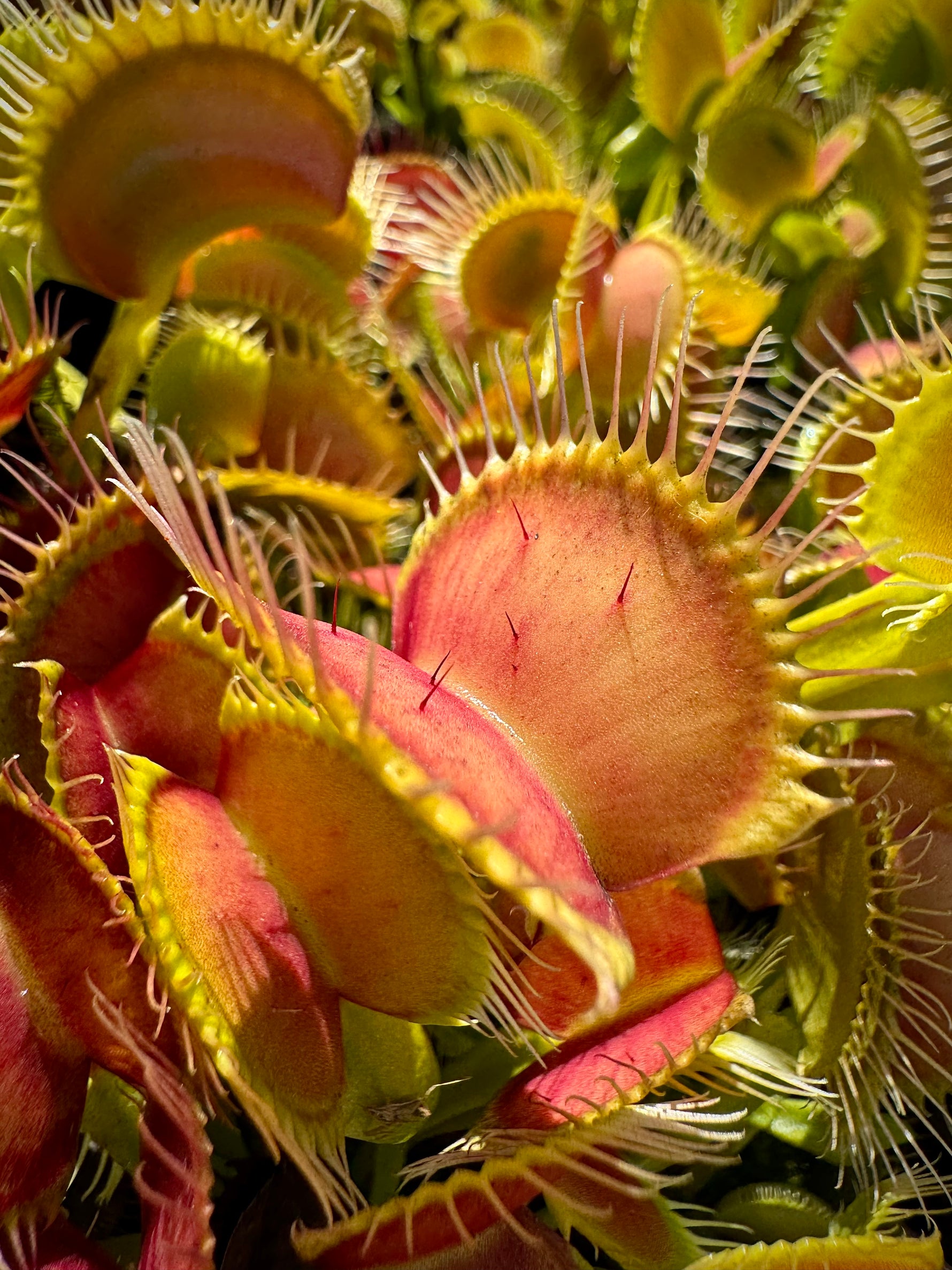 Sun: Full sun. Venus flytraps require lots of direct sun to grow and produce traps. In many areas, they can be grown outdoors in full sun. If you live in a very hot AND very dry place like Arizona or Sacramento, for example, you will want to grow your plants in full morning sun with protection from the afternoon sun or under 30% shade cloth. It is common for several traps/leaves to "burn" and die back when you first place your plant into the sun; your plant is acclimating to your conditions, and in most cases, new leaves will soon grow and be fully acclimated. Venus flytraps can be grown indoors, on extremely sunny windowsills, that receive all-day sun, but they will require a grow light in most circumstances due to the amount of light the plant needs. Grow lights should be 6-12” from the plant, depending on the light, and on a 10-12 hour day length. Venus flytraps generally are not a good candidate for a terrarium as they need intense light and good airflow. Grow outdoors if possible for best results.