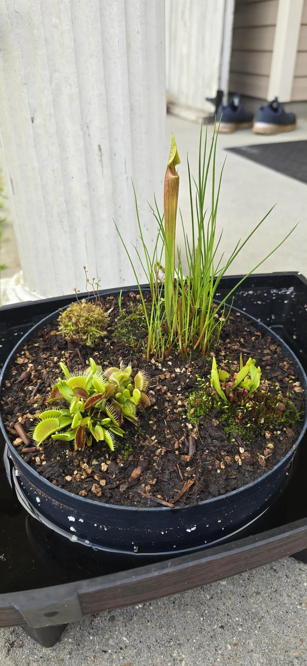Water: Always keep them in a saucer with a few inches of distilled, rainwater, or reverse osmosis water. Never let them dry out, especially in the hot summer months. Venus flytraps are bog plants that prefer water-logged conditions unless you live somewhere both very hot AND extremely humid, like Alabama. In that case, let the water tray dry out for a day or two between refills. Always use distilled, reverse osmosis, or rainwater only. These plants are especially sensitive to their water quality, and giving them mineral and salt-free water is very important. In winter, when the plants are dormant, you can let them dry out a bit between rain storms, but do not let the soil get so dry that it pulls away from the edges of the pots. Be sure to supplement water as needed in between rains in winter.