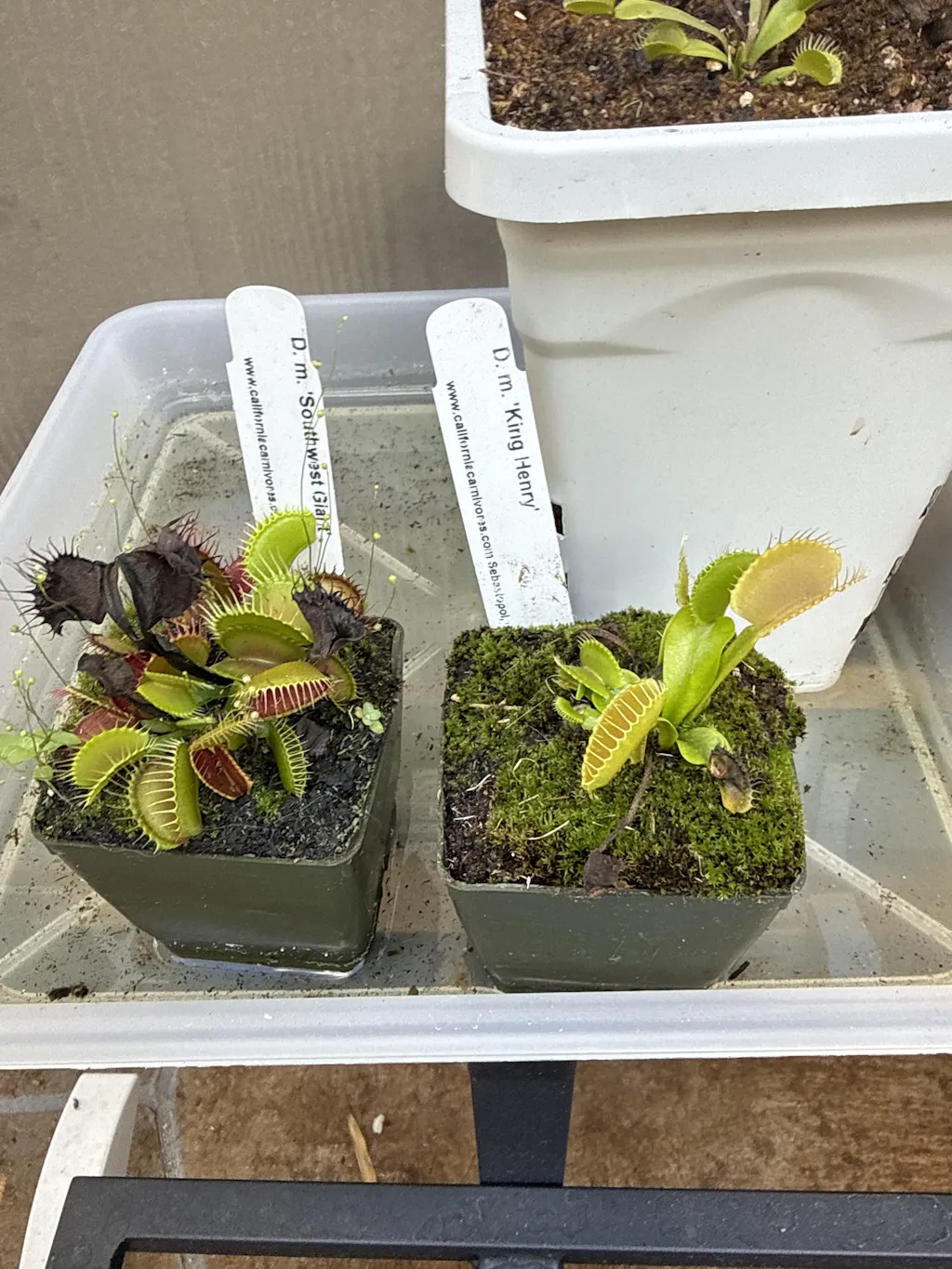 Water: Always keep them in a saucer with a few inches of distilled, rainwater, or reverse osmosis water. Never let them dry out, especially in the hot summer months. Venus flytraps are bog plants that prefer water-logged conditions unless you live somewhere both very hot AND extremely humid, like Alabama. In that case, let the water tray dry out for a day or two between refills. Always use distilled, reverse osmosis, or rainwater only. These plants are especially sensitive to their water quality, and giving them mineral and salt-free water is very important. In winter, when the plants are dormant, you can let them dry out a bit between rain storms, but do not let the soil get so dry that it pulls away from the edges of the pots. Be sure to supplement water as needed in between rains in winter.