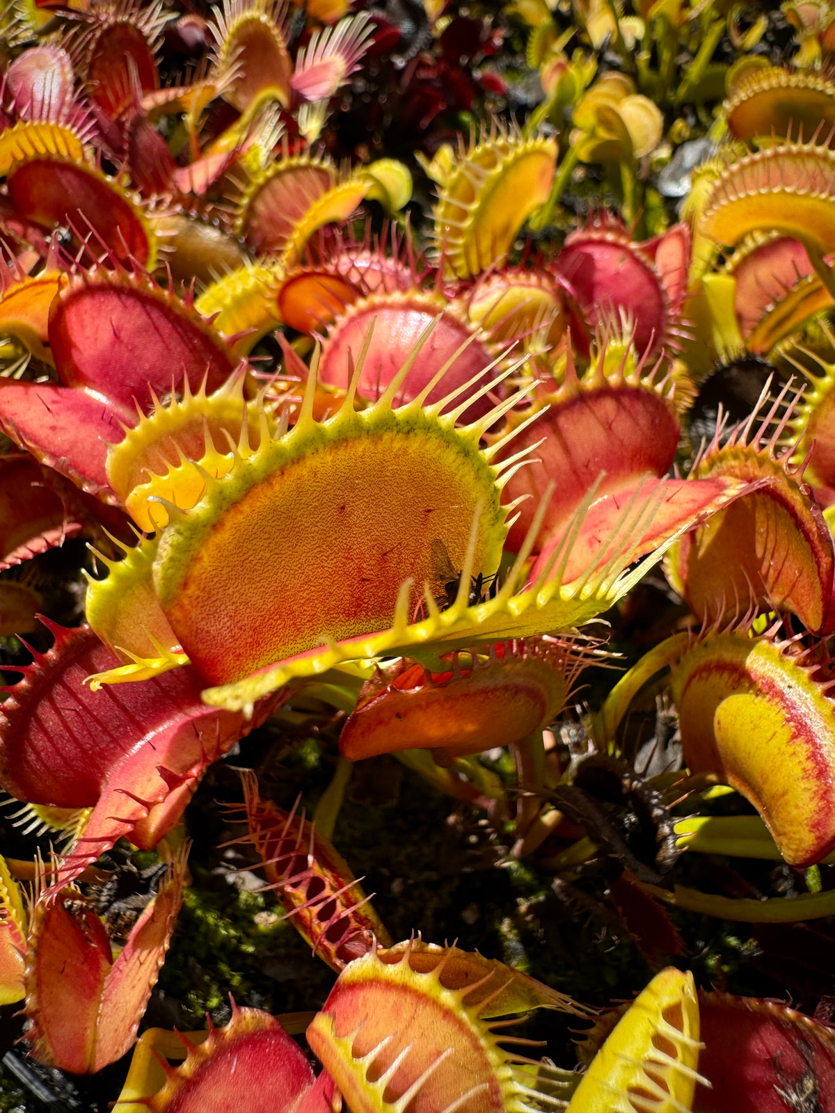Growth Habit: Venus flytraps are low-growing bog plants native to North and South Carolina. These plants grow their traps, modified leaves, from a rhizome that spreads over time. The traps will die back frequently all year, have high leaf turnover, and many new traps will grow throughout the spring and summer. In spring, the traps grow, often low to the ground and small. In summer, they grow their best traps, taller and more prominent. As Fall comes on, the traps start to die back, growing lower to the ground and smaller, and by winter, the plant will be dormant, with many or all of the traps gone, but the rhizome remains healthy and intact throughout winter dormancy even if you cannot see any traps growing. Venus flytraps have black roots, and not generally not many of them.