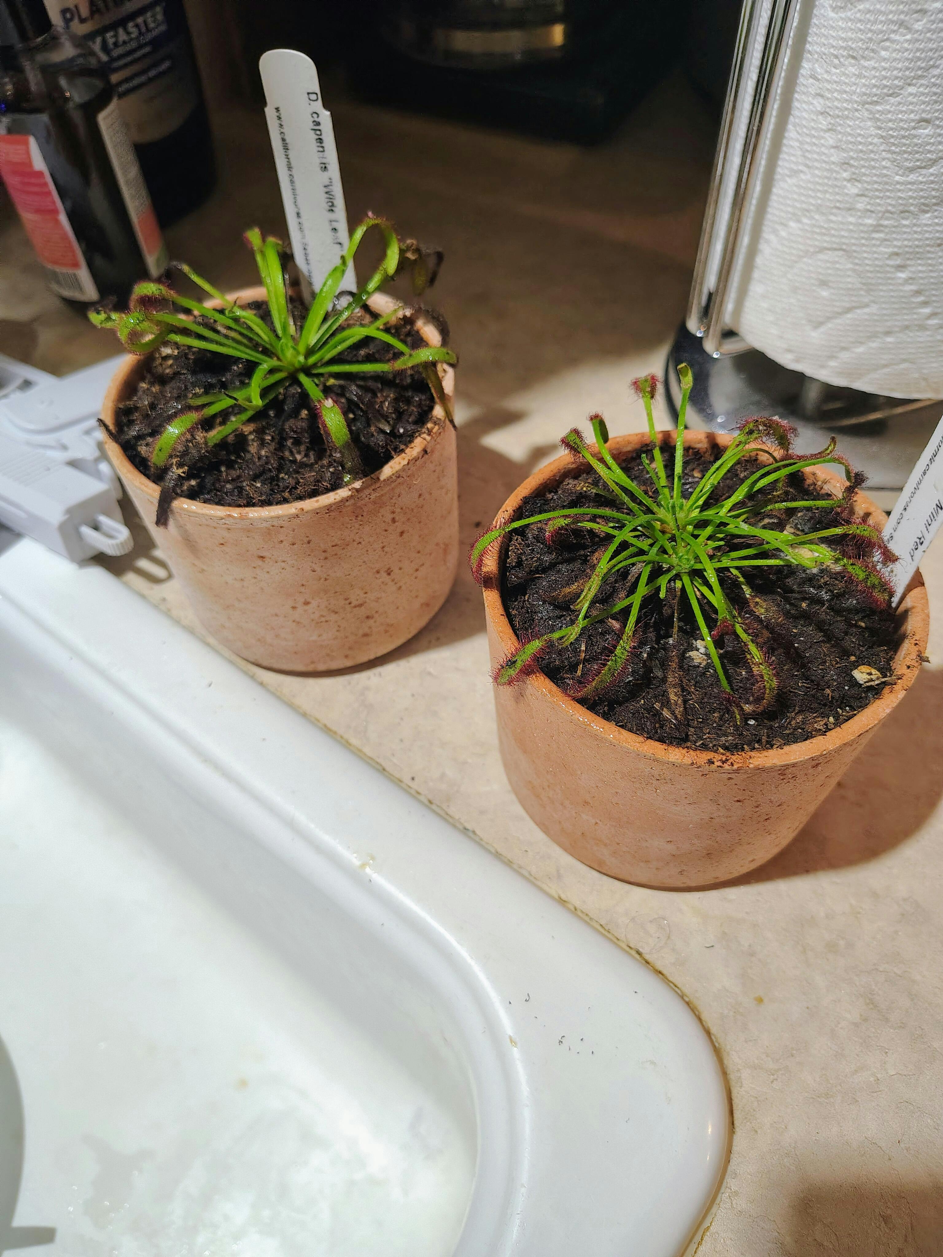 Temperature and Dormancy: Drosera capensis tolerate a wide range of temperatures but will be happiest in 40 - 80 degrees. They can take temperatures from freezing to 100 degrees but only for short periods and can grow back from the roots after a freeze if the daytime temperatures increase above 40. Drosera capensis do not need a dormancy but will die back or slow growth in winter depending on the conditions they are exposed to. If exposed to freezes, they will die back. And many will slow their growth or grow smaller in winter. Drosera capensis does need a nighttime drop in temperatures of 10-20 degrees; if you’d like to grow this in a tropical zone, we recommend the ‘Alba’ cultivar as it can tolerate no nighttime drop in temperature.