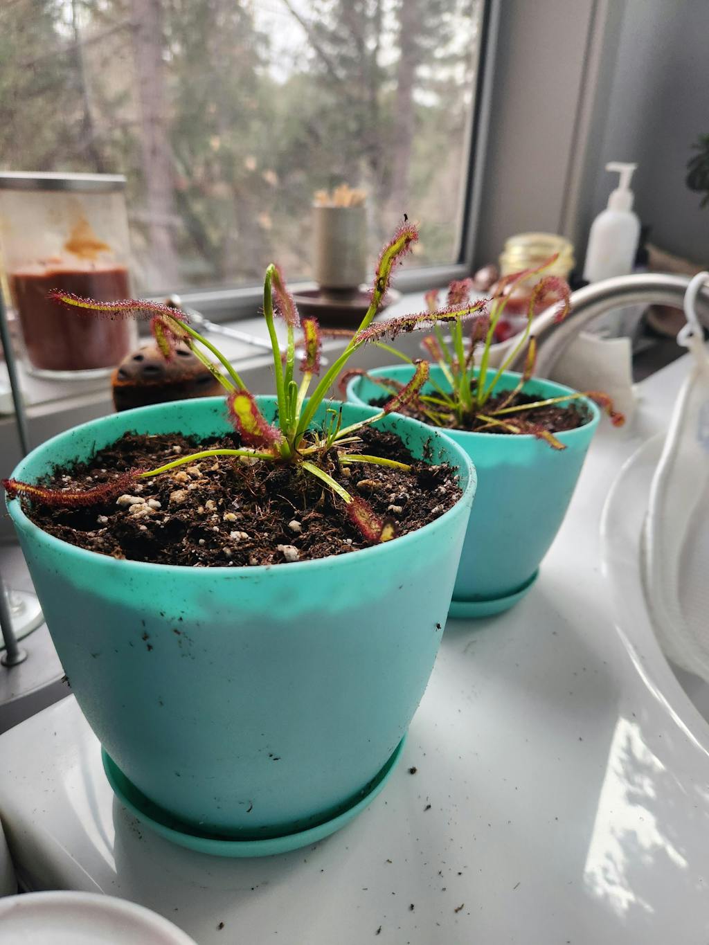 Sun: Full sun. Grow indoors on a sunny windowsill, in a terrarium under lights, or outdoors. If grown indoors, Drosera will require full sun to produce their sticky dew, so be sure to place them in a window where they will receive direct sunlight for most of the day. If grown under lights, keep your grow lights on a 10 to 12-hour day length and hang your grow lights 6 to 10 inches above the plants on the quality of your lights. Grown outdoors, these plants will enjoy a great deal of sun. If you live somewhere extremely hot, for example, Arizona, you will want to protect them from the Full intensity of the afternoon sunlight. You can either grow them in morning sun only, or use shade cloth to help protect them in these very hot areas. These plants may be more colorful and smaller when grown outdoors because the light is more intense. You can expect a few leaves to burn back when you first place your plant outdoors in the sun, and if you receive your plant in the summer, it is a good idea to slowly acclimate it to the sunlight over a day or two. Even in less sunny seasons, areas, or with acclimation, you can still expect to see some burned leaves when first placed outside. This is normal, and new leaves will grow that are more adjusted to the sun. In winter, when grown in sunlight, indoors or outdoors, it is very normal for color to fade from red varieties due to less sun. IF YOUR SUNDEW IS NOT PRODUCING DEW, IT MOST LIKELY NEEDS MORE SUNLIGHT. It can also take a few weeks after shipping for dew to generate.