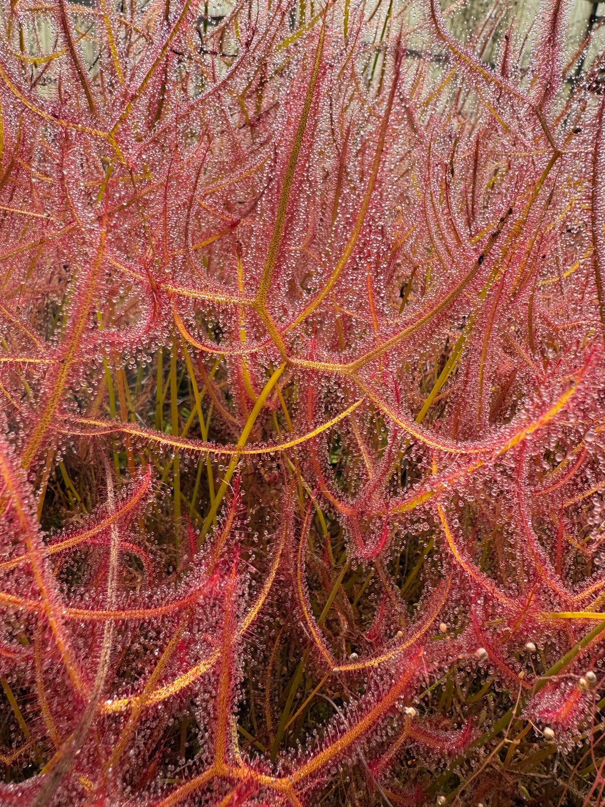 The most beautiful of the fork-leaf sundews, Drosera multifida 'extrema' leaves, can be up to a foot across and branch over 32 times, like the first photo, which is of a mature plant we’ve had in the nursery for years! The entire plant is red in high light. Old mature plants will surround a hanging pot with red sticky leaves. They don't always go dormant, but they will in cooler temperatures.