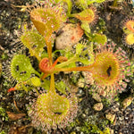 Growth Habit: Tuberous Drosera are very unusual plants. Only growing for the cold months of the year, they grow like a magic trick suddenly and quickly in winter once their dry pots are put in water! They grow from tubers in the soil that can be very, very tiny, depending on the species and age of the plant. When watered, the tuber will produce a vertical stolon, making its way to the soil surface. This stolon is fragile, and we do not recommend repotting it when the plant is actively growing as it is very easy to break. Through the winter the leaves will grow in rapidly and the plant will catch insects and flower. Then, as the heat of late spring and summer approaches, the plants brown and die back. In active growth, it is normal for the leaves to die back, turn brown, and grow new leaves. Nearly all tuberous drosera are self-sterile, and you will need two genetically different clones to make viable seed. This species produces thick stems up to six inches tall, with cupped leaves.