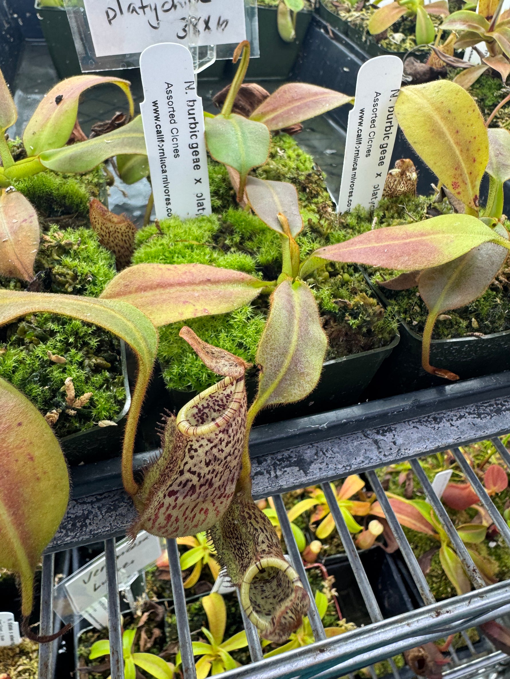 These should also have really fun upper pitchers, as both species have unusual uppers! Nepenthes burbidgeae has beautiful, elegant upper pitchers, while the upper pitchers on Nepenthes platychila are uniquely flared, or flanged.