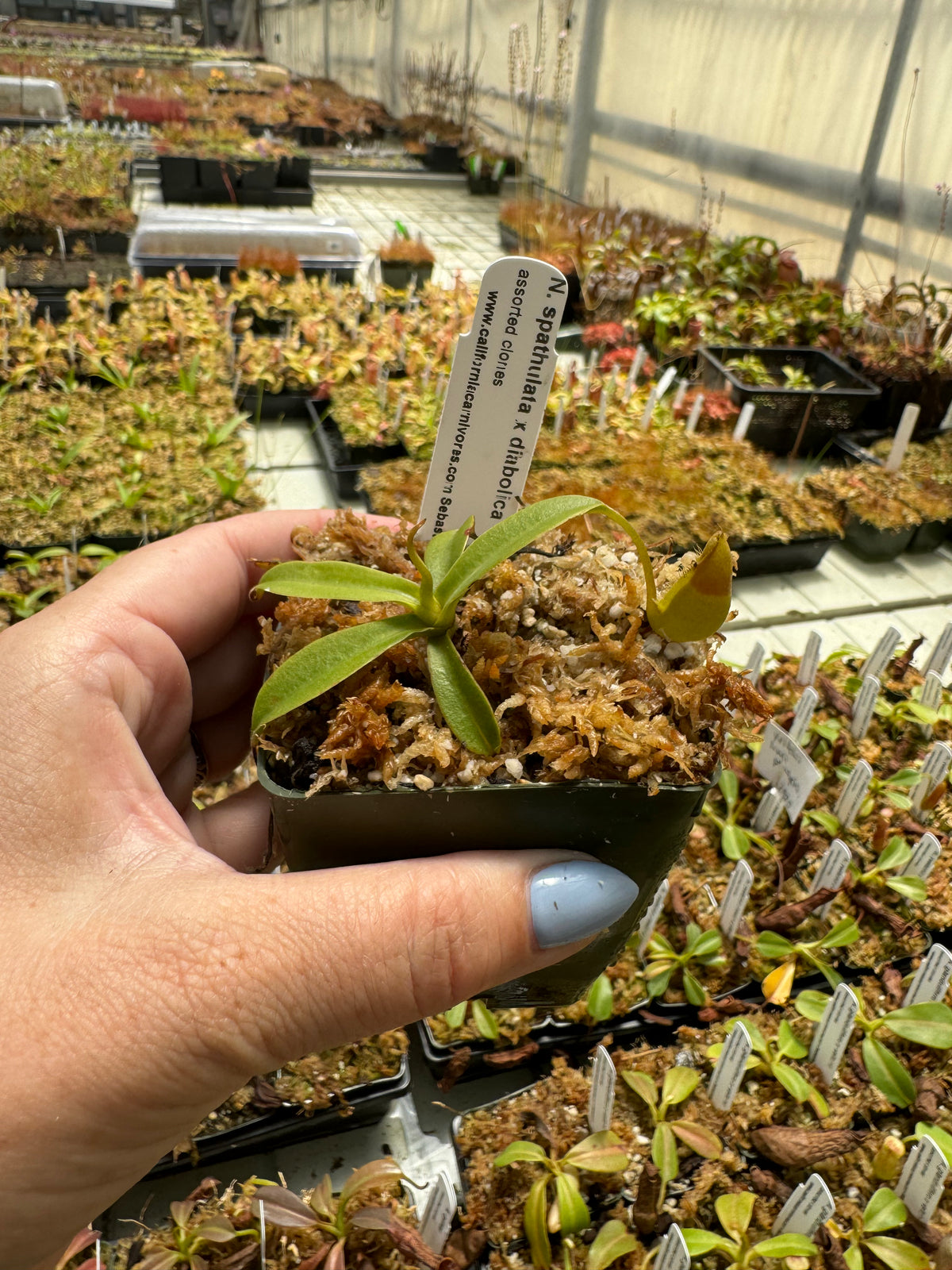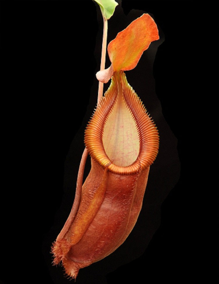 Nepenthes spathulata x diabolica is a super exciting new hybrid out of Borneo Exotics breeding program! Diabolica, previously called ’hairy red’ hamata is a spectacular red, toothy hamata and they’ve combined this with the vigor and size of spathulata! These are easier to grow than pure diabolica but with all the fun color and toothiness!