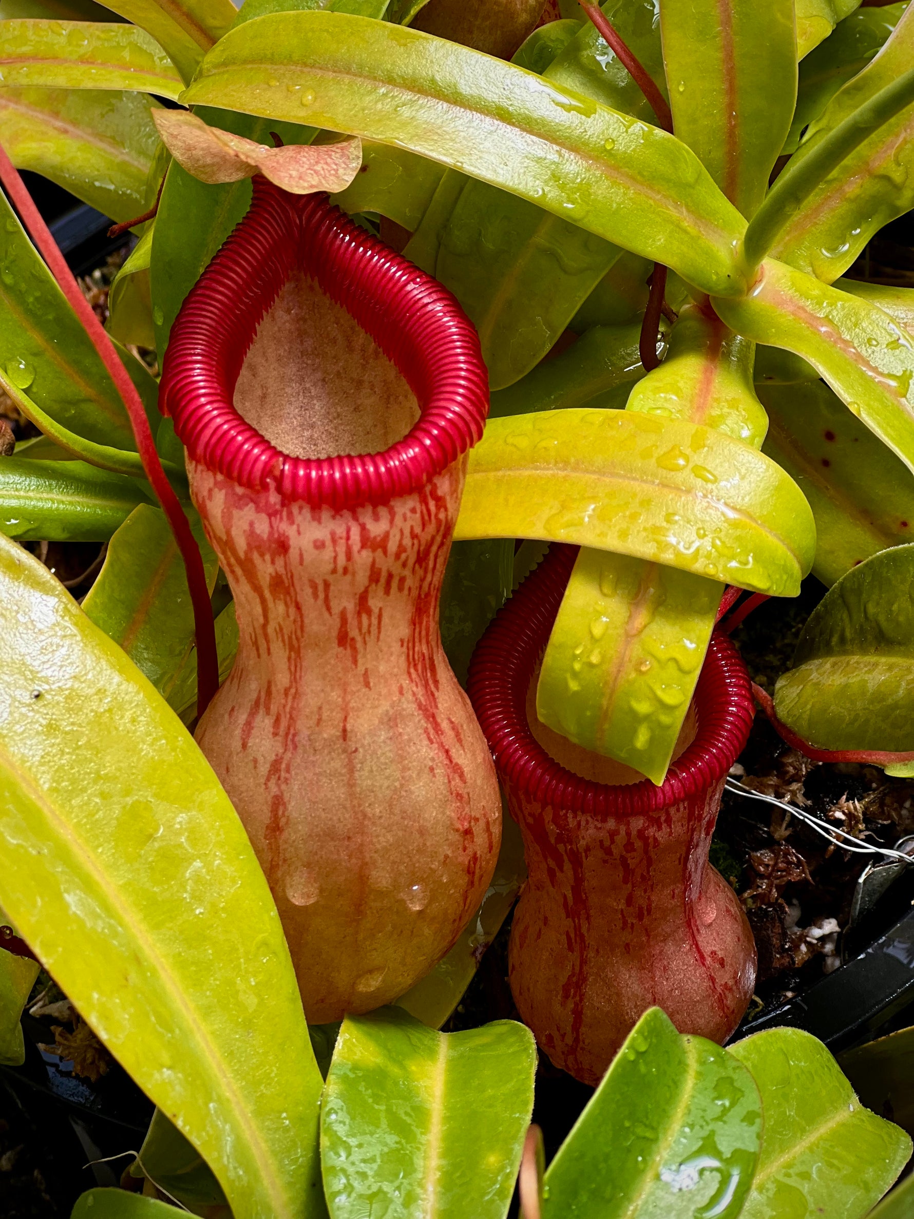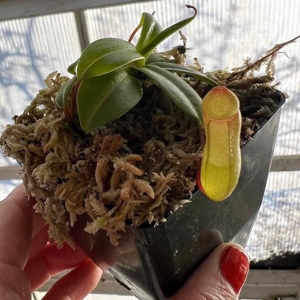 Nepenthes ventricosa is possibly the easiest highland species to grow! This is the red form of Nepenthes ventricosa and it's pitchers have a lovely red peristome. As they grow it's tubby pitchers may be constricted at the waist, turning pale green to red-infused with compact stems. This is the number one choice to try on a windowsill or tank, very easy, vigorous and attractive.