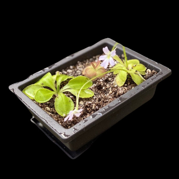 Soil & Repotting: Pinguicula grow in very dry and rocky soil mixes, do not use a mix that holds a lot of moisture. We use equal parts sand, peat moss, pumice, and perlite. You can order our custom Pinguicula soil mix! These plants ship bare-root so you will have to order potting media and pot them up upon arrival. Pinguicula do not have extensive roots and anchor to the surface of their soil making them ideal candidates for quirky, cute, small, non-draining planters like teacups or vintage pottery. You can plant them in all variety of pots as long as they are glazed ceramic, glazed terracotta, glass or plastic. Avoid un-glazed terracotta. They can be in small pots and do not need much room for roots. Pinguicula are one of the most sensitive plants to a build of minerals and salts in their soil or water. Repot every year to refresh soil.
