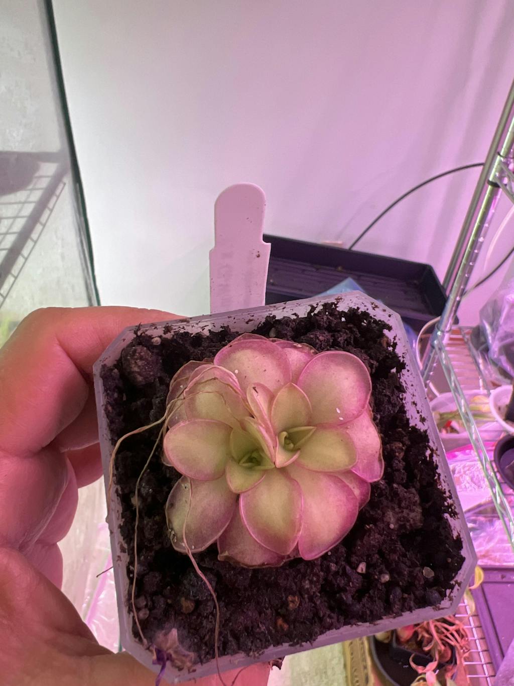 Growth Habit: Pinguicula are generally small plants; depending on the species and growth phase, they can range from 1/2” to 8” across at maturity. Most are 2-4” across. They form rosettes of leaves covered in glistening dew, which have a high turnover rate, meaning that they die back frequently, and new leaves grow at the center from the plant. They have pretty leaves, some blush red or purple, and all are covered in sparkling dew. Their flowers are hummingbird and butterfly pollinated in the wild and because their pollinators are attracted to colorful flowers, they have beautiful flowers With long neck spurs! Many species will experience a winter succulent phase. A combination of shorter photo periods, cooler temperatures, and dryer conditions trigger this phase. While this phase is not necessary for the plant to thrive, it is often out of our control whether the plants do this or not. During their succulent phase, they grow small, rounded leaves that look very different from their large carnivorous leaves. Plants in this stage will be significantly smaller than they will be in carnivorous growth. The natural cycle of Pinguicula can lead them to be in succulent growth in spring, not starting their carnivorous growth until late spring sometimes even early summer. Watching them grow their carnivorous leaves is like watching a magic trick; tiny, tight leaves begin to transform into huge, sticky, carnivorous leaves! Pinguicula can easily propagate from leaf pullings, like a succulent. They will also form small clumps over time, dividing naturally. While they can have a long life, they won’t live forever, so it is a good idea to take pullings every year. They do not have significant root systems, and the roots they have are often minimal and very short. The roots can be white, transparent, or brown, and they use these roots mainly to anchor themselves to the soil's surface (they still offer benefits, though, so please do not cut them off).