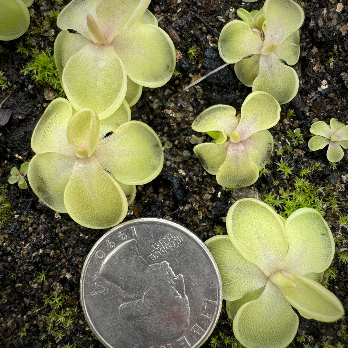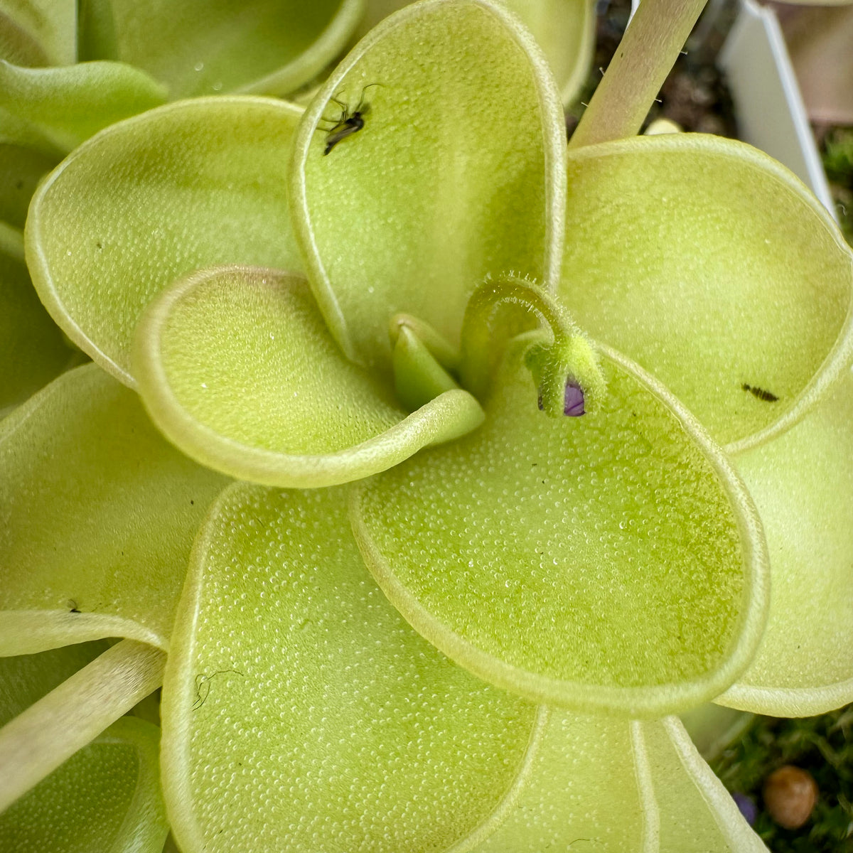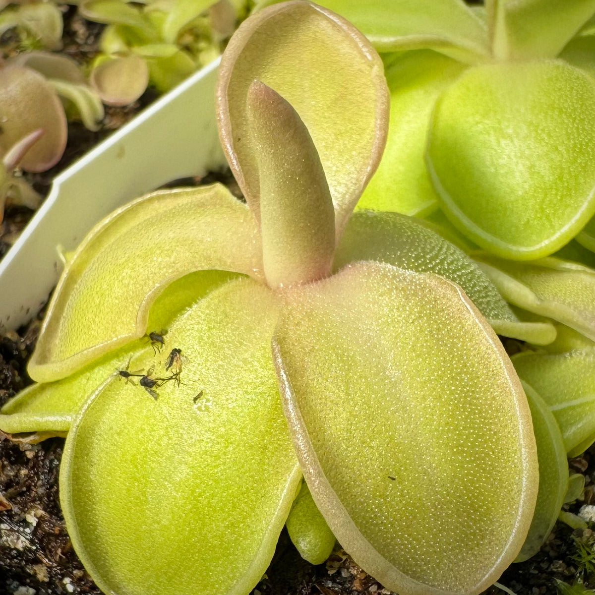 Pinguicula x “Piggyback” is a miniature hybrid with beautiful pale green rosettes and cute pointed leaves with gently rolled margins. Under high light the rosettes can blush a soft pink! This one is a bloomer and under ideal conditions it should be under almost constant bloom with its cute little pink flowers! Ideal for ping rocks and terrariums!
