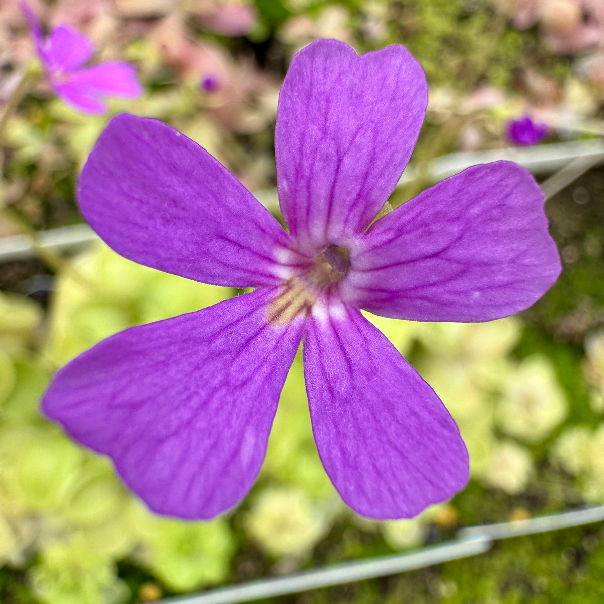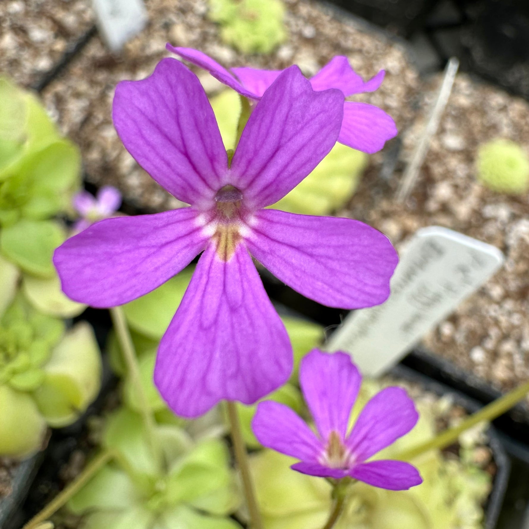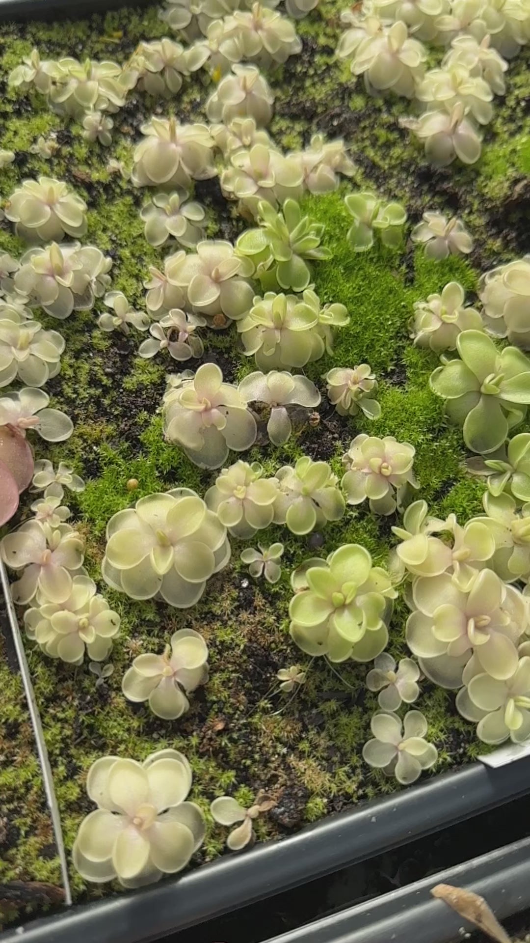 Growth Habit: Pinguicula are generally small plants; depending on the species and growth phase, they can range from 1/2” to 8” across at maturity. Most are 2-4” across. They form rosettes of leaves covered in glistening dew, which have a high turnover rate, meaning that they die back frequently, and new leaves grow at the center from the plant. They have pretty leaves, some blush red or purple, and all are covered in sparkling dew. Their flowers are hummingbird and butterfly pollinated in the wild and because their pollinators are attracted to colorful flowers, they have beautiful flowers With long neck spurs! Many species will experience a winter succulent phase. A combination of shorter photo periods, cooler temperatures, and dryer conditions trigger this phase. While this phase is not necessary for the plant to thrive, it is often out of our control whether the plants do this or not. During their succulent phase, they grow small, rounded leaves that look very different from their large carnivorous leaves. Plants in this stage will be significantly smaller than they will be in carnivorous growth. The natural cycle of Pinguicula can lead them to be in succulent growth in spring, not starting their carnivorous growth until late spring sometimes even early summer. Watching them grow their carnivorous leaves is like watching a magic trick; tiny, tight leaves begin to transform into huge, sticky, carnivorous leaves! Pinguicula can easily propagate from leaf pullings, like a succulent. They will also form small clumps over time, dividing naturally. While they can have a long life, they won’t live forever, so it is a good idea to take pullings every year. They do not have significant root systems, and the roots they have are often minimal and very short. The roots can be white, transparent, or brown, and they use these roots mainly to anchor themselves to the soil's surface (they still offer benefits, though, so please do not cut them off).