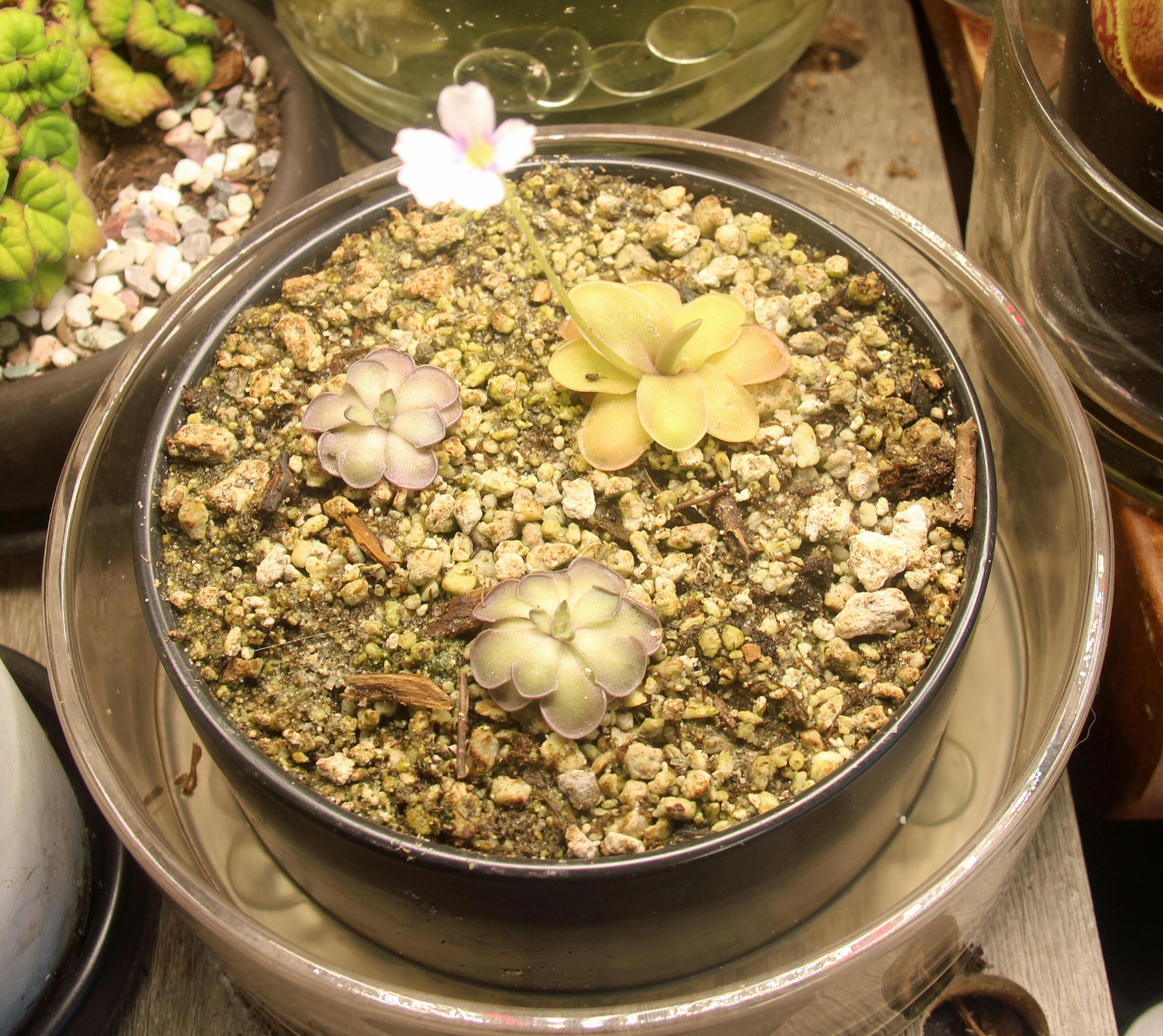 Water & Humidity: In the late spring, summer, and early autumn, Pinguicula can be kept in the tray system with overhead watering as long as they still have carnivorous foliage. This means setting the pots in a deep saucer or tray and routinely filling that with 1/4”-1/2” water. If grown in a non-draining pot, allow room to water and water overhead frequently to keep soil media moist, but do not water so deeply as to have standing water sitting on the surface of the soil; all the water should be absorbed. When the rosettes show their very first signs of growing their smaller, tighter succulent leaves immediately begin to dry out your plants. Keep the soil on the dry side, watering them only a little and let dry out in between watering. You can usually tell how dry a species enjoys its winter by the size of its succulent leaves. The tighter, smaller leafed rosettes such a Pinguicula gypsicola or the bulb-like heterophylla and macrophylla require bone-dry conditions. Species with larger winter leaves, like a few of the moranensis varieties or agnata, enjoy winters soils just slightly damp. Cuban species should be kept wet year-round, with only slight winter drying. When these plants are transitioning between carnivorous and succulent growth they are at the most risk of rotting, so it is better to air on the side of drier when the temperatures start to get colder and the photo periods shorten. In spring, as soon as the temperatures start to warm and the photo periods lengthen, start watering your plants more. When carnivorous leaves start to grow, begin the tray method again. (If your plant decides it does not want to make carnivorous leaves, don’t worry, sometimes they are stubborn! Water frequently and make sure your plant gets lots of light, preferably some natural light from the sun as well, to try to trigger carnivorous leaf growth. But don’t worry if your ping stays in succulent mode for a whole year, eventually it will grow carnivorous leaves again!) Pinguicula are extremely susceptible to dissolved minerals and salts in their water and poor water quality will directly contribute to decline of plants and death. Be sure to only use rainwater, reverse osmosis water, or distilled water. Pinguicula prefer drier conditions and do not require high humidity.