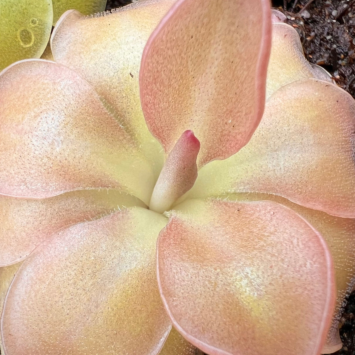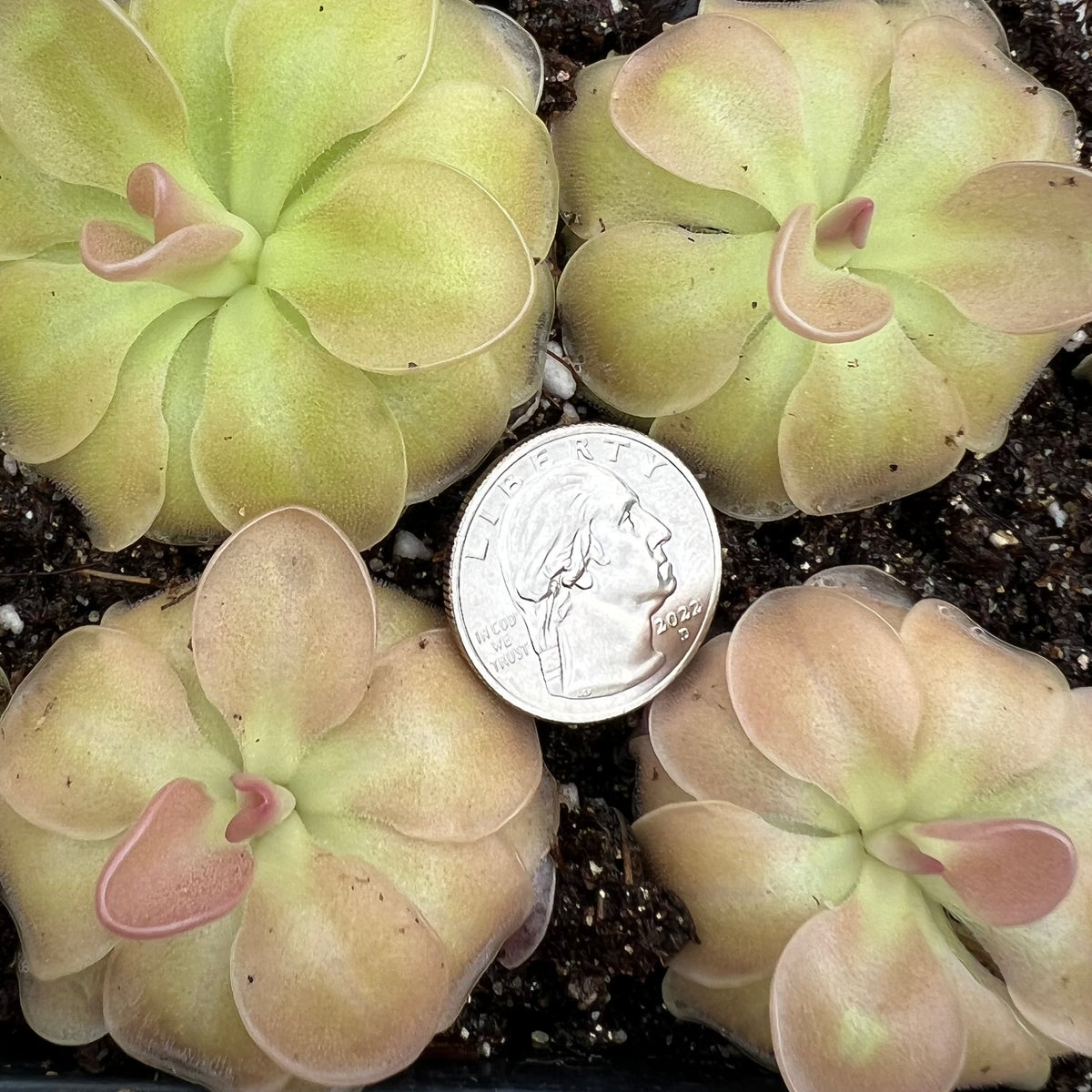 This hybrid of Pinguicula ehlersae x moranensis has rosettes that are pale white with a pink blush and grow up to 3 inches across! It flowers readily, producing many, many pink flowers with white throats. This versatile and easy-growing plant blooms readily and doesn’t need a succulent winter dormancy.