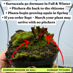 DORMANT SEASONALLY, STARTING AS EARLY AS OCTOBER AND LASTING AS LATE AS MARCH, DEPENDING ON THE CONDITIONS AND SPECIES/HYBRID. The pitchers turn brown and die back to the rhizome, or non-carnivorous leaves (phyllodia) grow during this time. Please see the final photo to see how Sarracenia look when dormant. They will begin to grow vigorously again in Spring when photoperiods lengthen and temperatures increase.