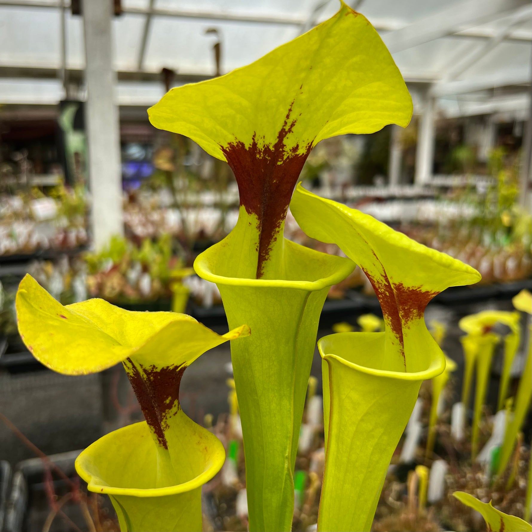 Sarracenia flava v. rugelii is the classic color form of Sarracenia flava. A dark blotch punctuates the vibrant, chartreuse pitchers at the throat. The dark red blotch starts as a thin, red line on seedlings and develops at maturity—wide, rounded, lightly undulating lids tower over the huge pitchers. We love this variety; large, lightly ruffly lids and electric green pitchers are always a cheerful harbinger of spring!