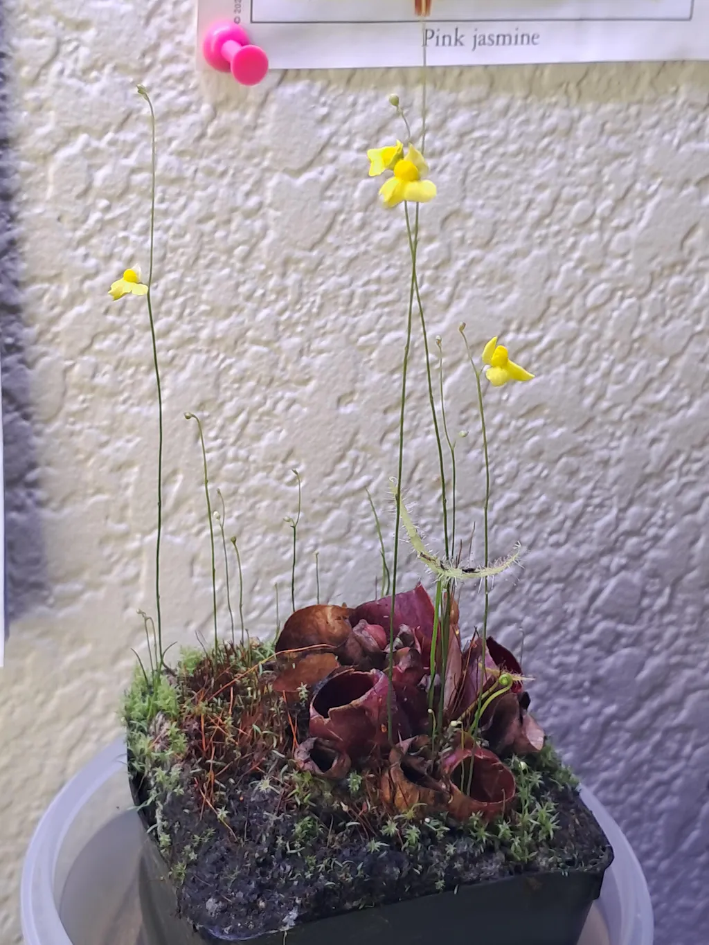 Feeding and Fertilizer: Sarracenia will catch plenty of food when grown outdoors. When grown indoors, they will significantly benefit from fertilizing, both a foliar fertilizer and feeding the pitchers. Plants grown outdoors will appreciate a foliar feed as well. Apply MaxSea fertilizer once per month to the foliage only. Dilute 1/4 teaspoon of MaxSea into one gallon of water and then apply to the pitchers, and inside the pitchers, with a mister bottle or a watering can. Osmocote slow-release flower and vegetable pellets can be dropped into the pitchers with a bit of distilled water. Pellets can burn the sides of the pitchers where they come to rest; that is normal.