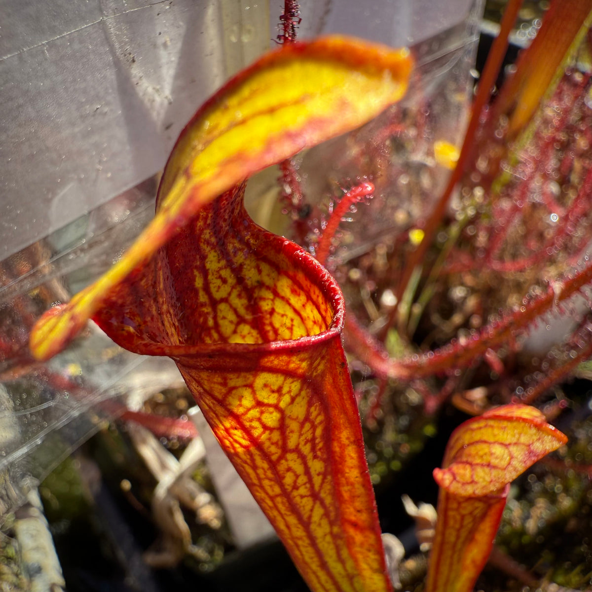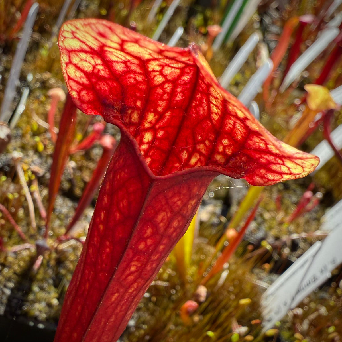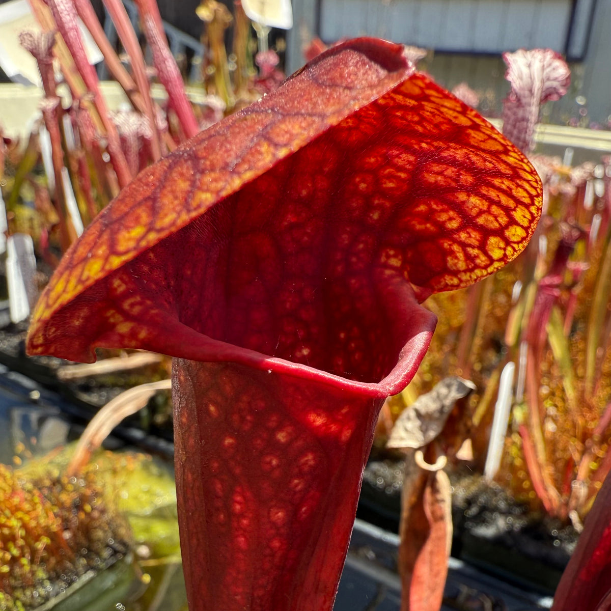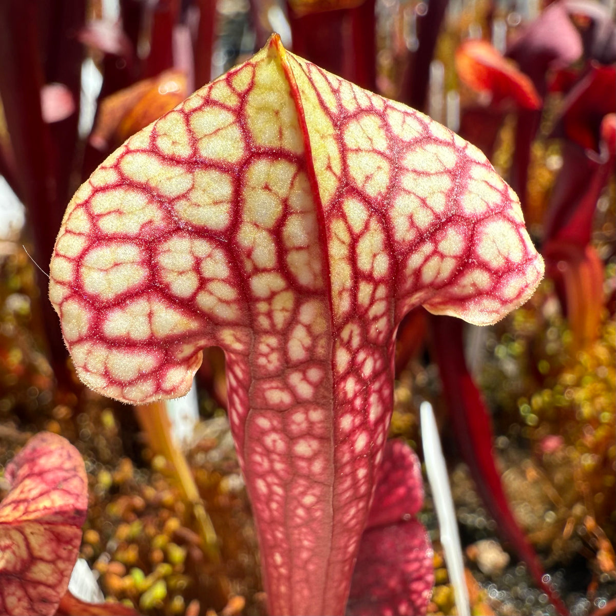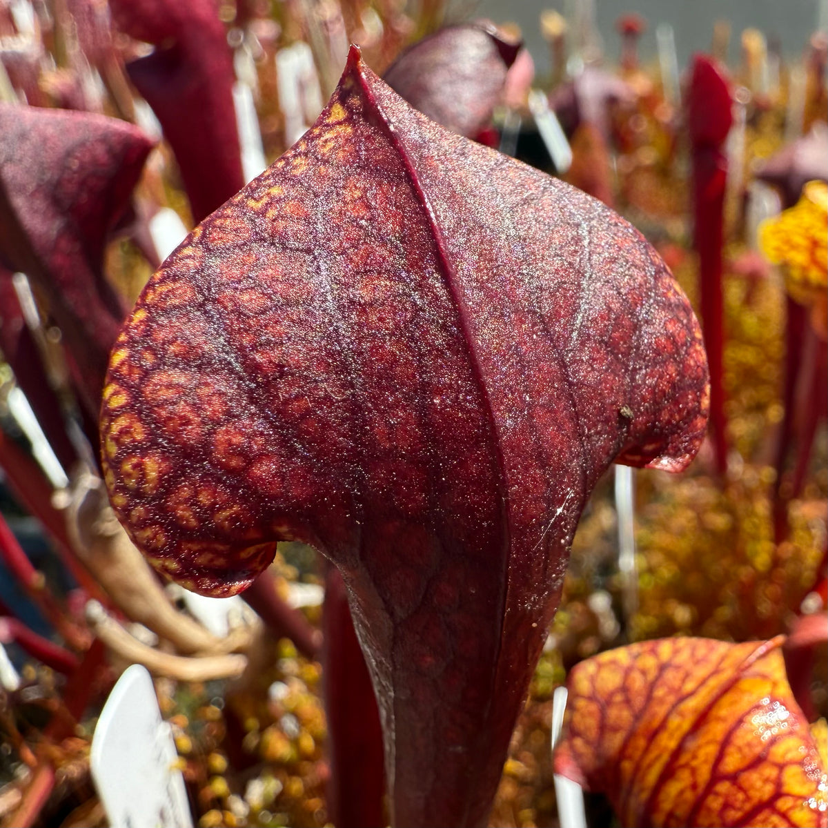 Sarracenia ( x ‘Ember’ ) x ( x ‘Saurus’ ) is a show-stopping new hybrid for 2025! ‘Ember’ is well known for its hooded, purple-red, plentiful pitchers. ‘Saurus’ is a Phil Faulisi creation that needs no introduction. It is widely considered the best and biggest dark red moorei out there! These plants have combined the best of both parents with profusions of pitchers with exaggerated lids and vivid fire-like coloration!