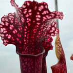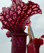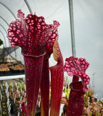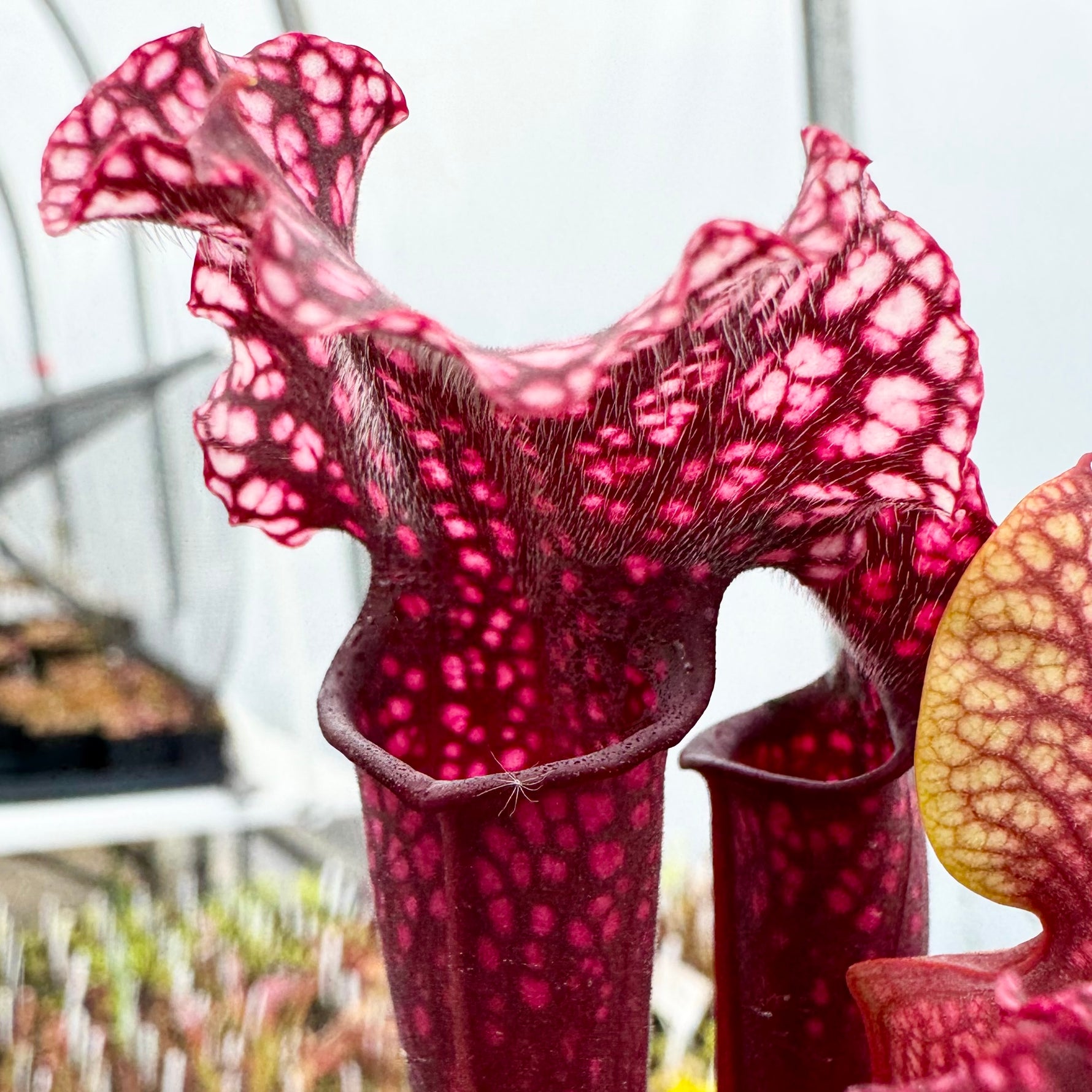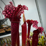 The compact pitchers have a wildly undulating lid and start green, dappled in whites and yellows. As they age, they transform into deep, dark red. This is probably the most popular of the hundreds of Sarracenia in our collection!