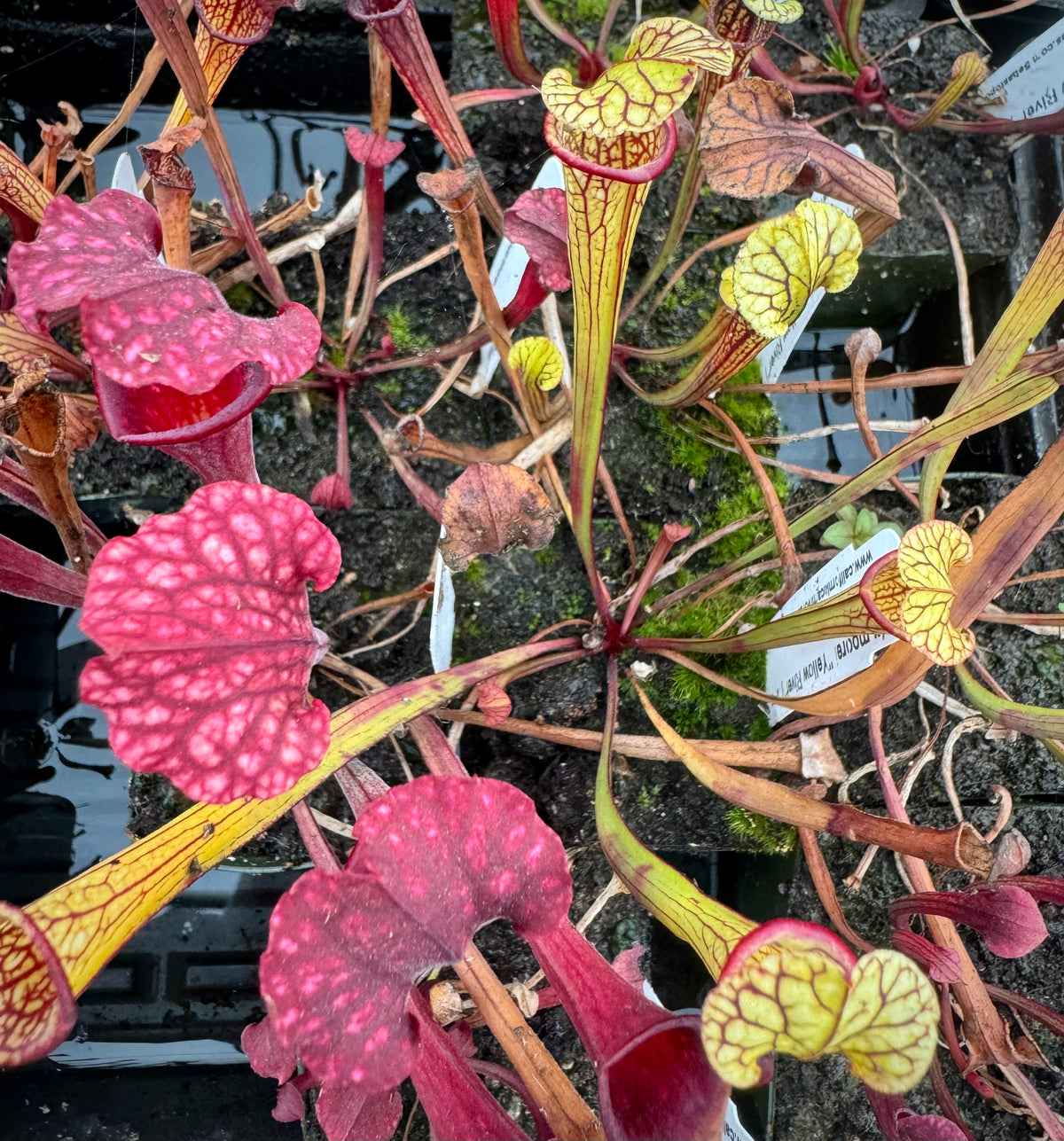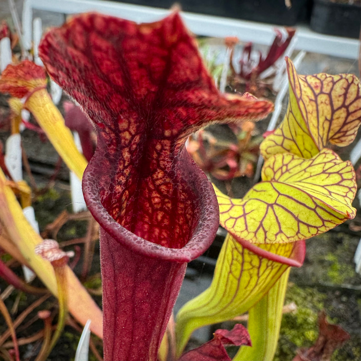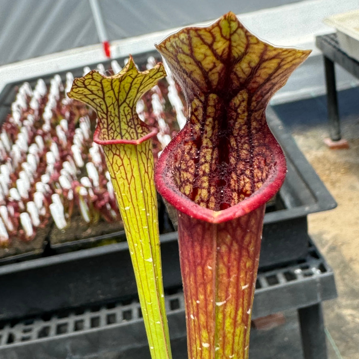 We are so excited to be releasing our ‘Saurus’ crosses! ‘Saurus’ is perhaps the most famous Sarracenia because of its size, deep red coloration, and fantastic boxy lip! It’s one of the best moorei ever created! Damon has combined that with the beautiful moorei “Yellow River” to make super-sized monsters! Sarracenia x moorei is the natural hybrid between flava and leucophylla.