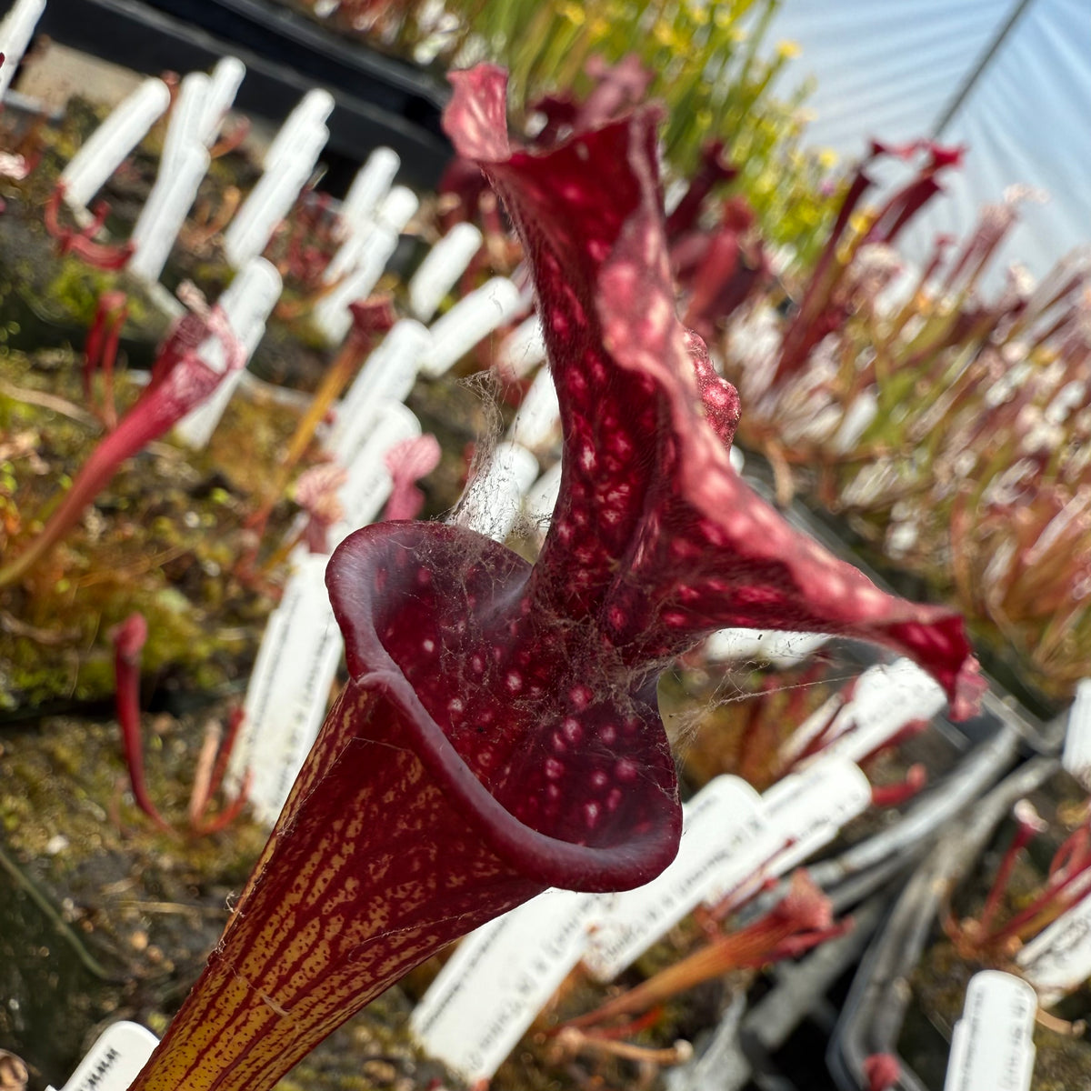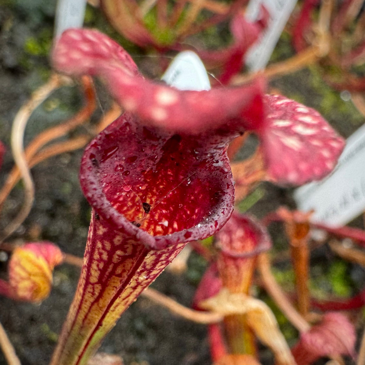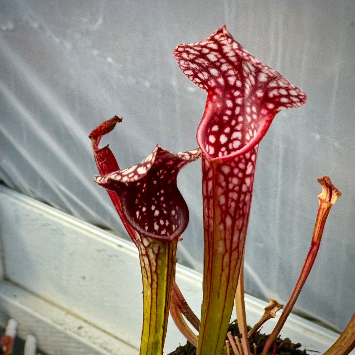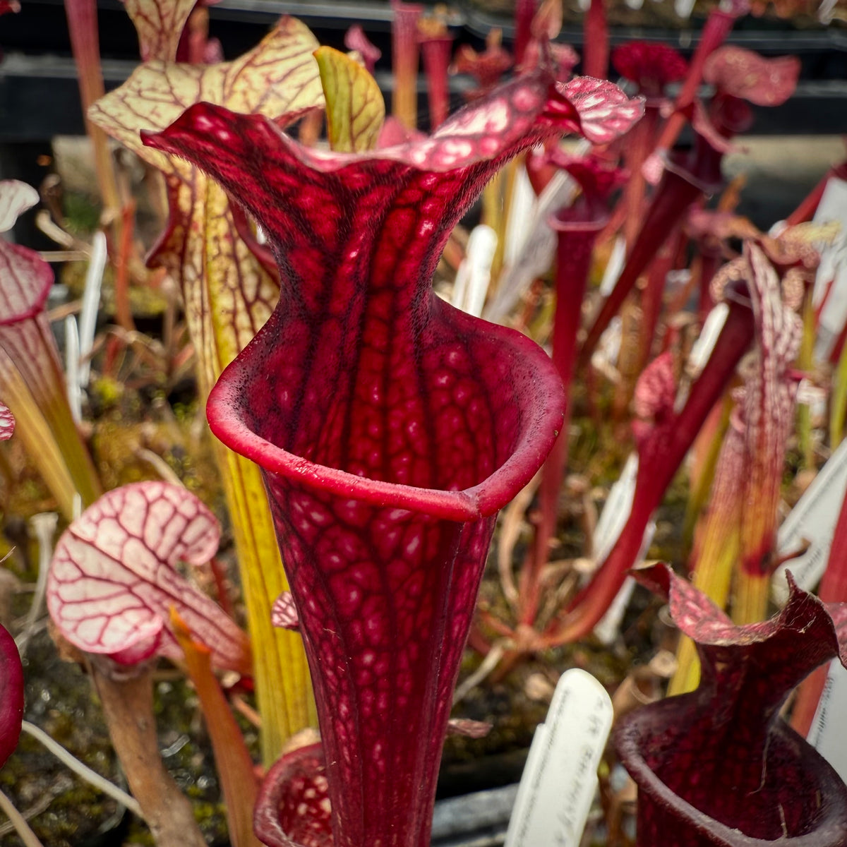 This is a dream cross that excites us even after hybridizing Sarracenia for over 30 years! ‘Caitrin Claire’ is one of the most stunning cultivars currently available. It has been aptly described as  ‘Adrian Slack’ on acid! There is a crazy, vivid quality to its coloring. Damon has crossed that with the deep, dark maroon monster, ‘Saurus,’ one of the largest x moorei that exists today!