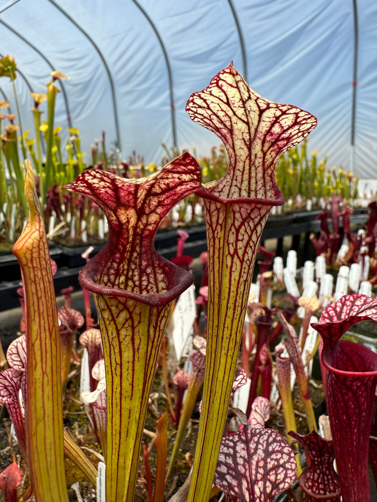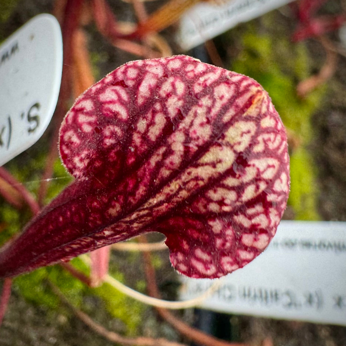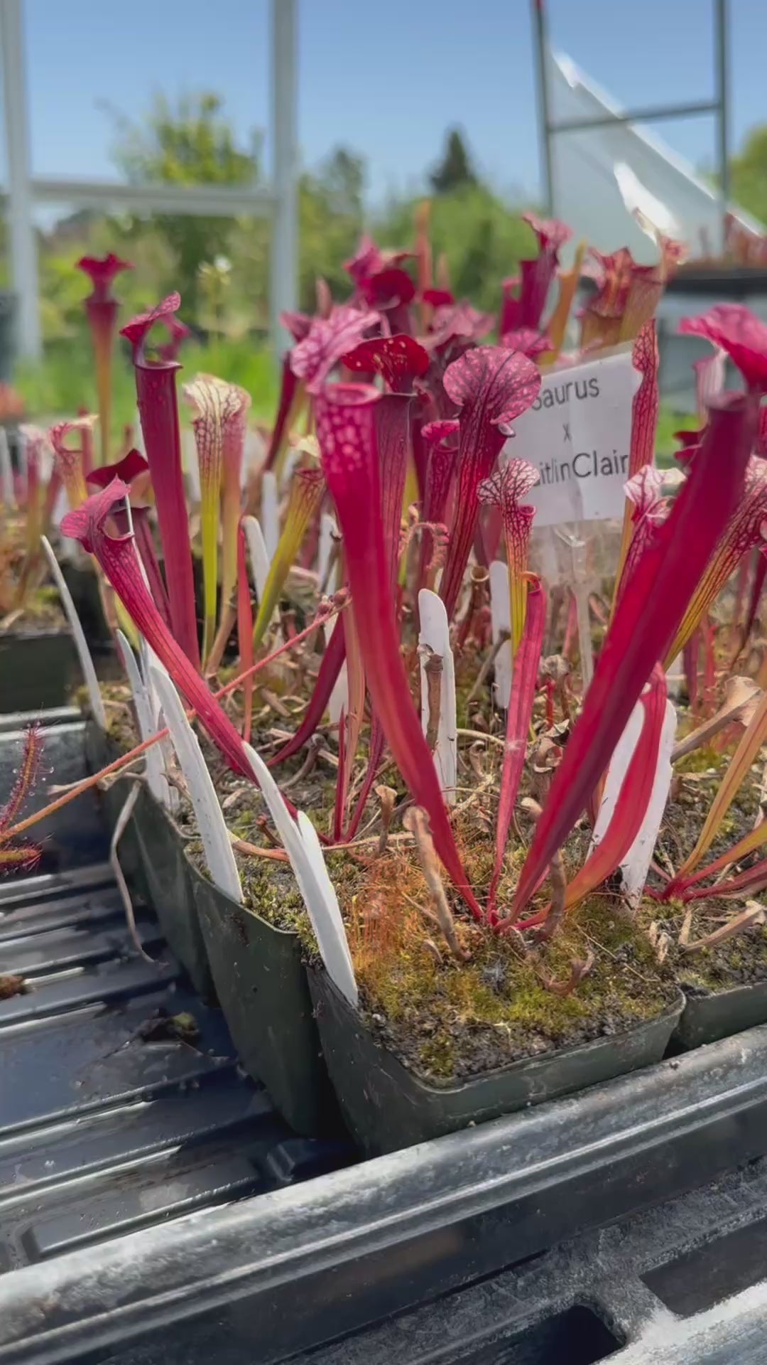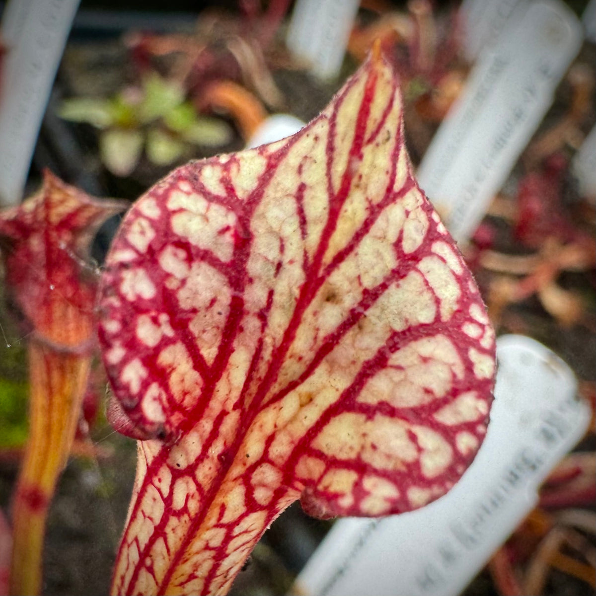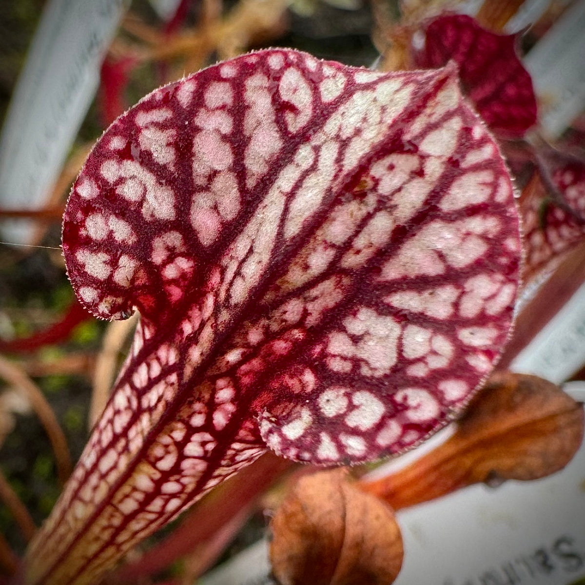 This is a dream cross that excites us even after hybridizing Sarracenia for over 30 years! ‘Caitrin Claire’ is one of the most stunning cultivars currently available. It has been aptly described as  ‘Adrian Slack’ on acid! There is a crazy, vivid quality to its coloring. Damon has crossed that with the deep, dark maroon monster, ‘Saurus,’ one of the largest x moorei that exists today!