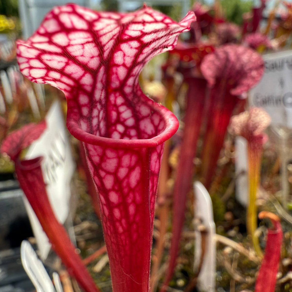 Sun: Full sun. Sarracenia require lots of direct sun to grow and form pitchers properly. In many areas, they can be grown outdoors in full sun. If you live in a very hot AND very dry place like Arizona or Sacramento, for example, you will want to grow your plants in full morning sun with protection from the afternoon sun or under 30% shade cloth. It is common for several pitchers to "burn" and die back when you first place your plant into the sun; your plant is acclimating to your conditions, and in most cases, new leaves will soon grow and be fully acclimated. Sarracenia can be grown indoors on extremely sunny windowsills that receive all-day sun, but they will require a grow light in most circumstances due to the amount of light the plant needs. Grow lights should be 6-12” from the plant, depending on the light, and on a 10-12 hour day length. Sarracenia generally are not a good candidate for a terrarium as they need intense light and get quite tall. Shorter species like Sarracenia purpurea will do better in a terrarium. Grow outdoors if possible for best results.