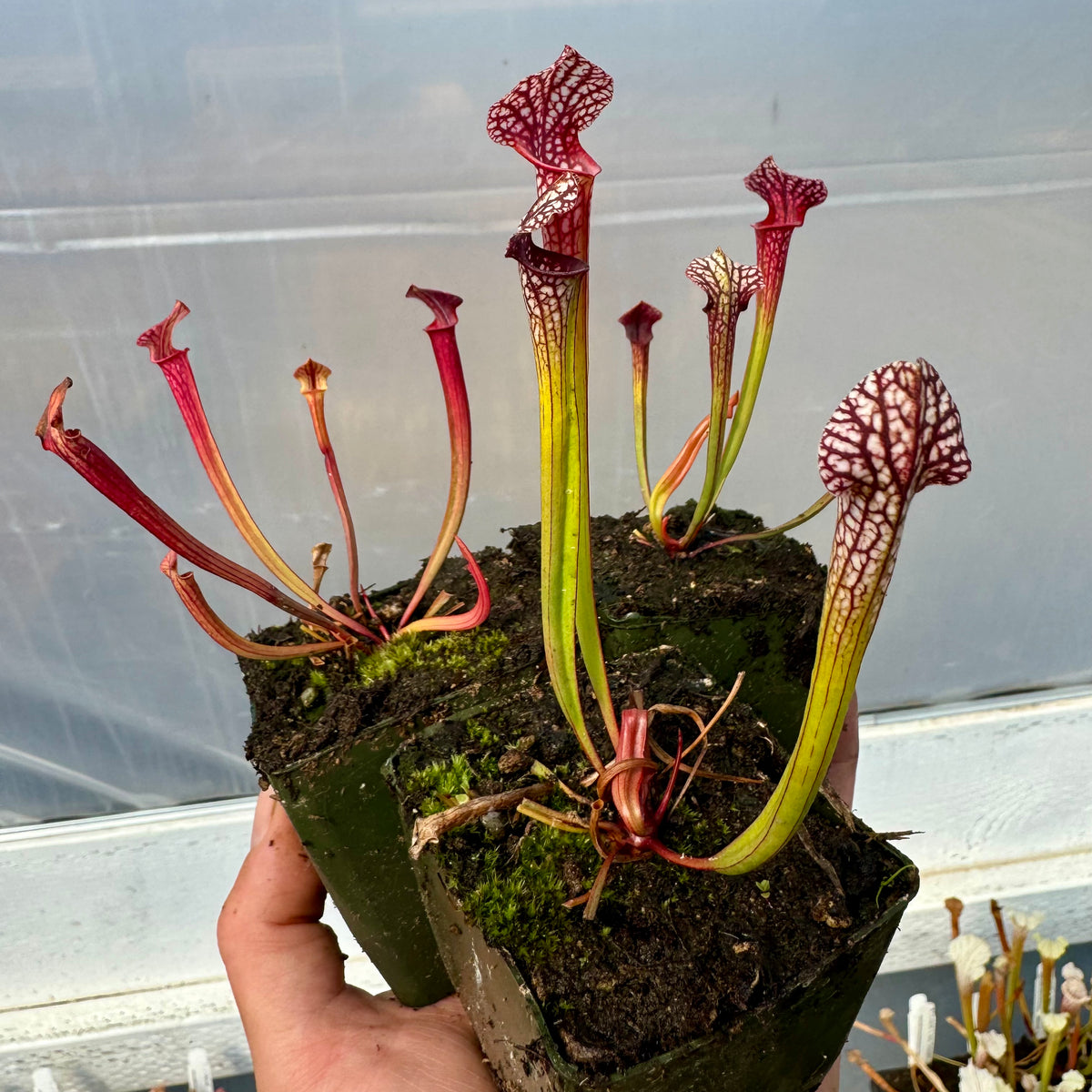 Soil and Repotting: We prefer a mix of four-part fertilizer-free peat moss to one-part perlite. You can add our pre-made mix to your order here. You do not need to repot your plant when you receive it from us for at least a year, and we recommend against it during the spring-summer months. Repot Sarracenia every 1-3 years in winter when they are dormant. Avoid placing in excessively large pots; size up only a few inches at a time. They do well in tall pots. Soil can also develop a swampy smell, especially right after shipping, when the plant is wrapped in plastic and sealed. This is normal; these plants grow naturally in bogs and swampy conditions, and peat moss can develop a bit of an anaerobic smell, but this does not indicate a problem with the soil.
